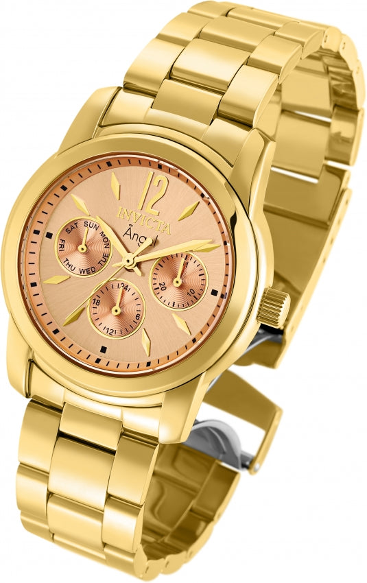 O relógio Invicta Feminino Angel 0464 é um impressionante relógio de luxo com tamanho de caixa de 38 mm em aço inoxidável e moldura também em aço inoxidável. Com sua coroa de empurre e resistência à água de 50m, você terá um relógio durável que combina elegância e funcionalidade. O movimento quartzo do calibre VH63 garante precisão e a banda de aço inoxidável na cor ouro adiciona um toque sofisticado. Um acessório premium para completar seu estilo exclusivo.