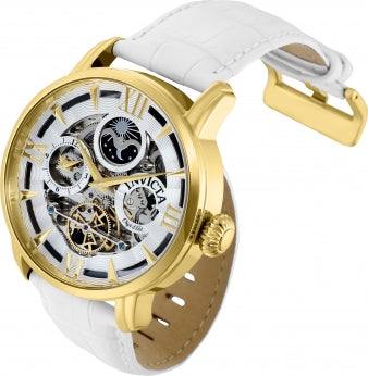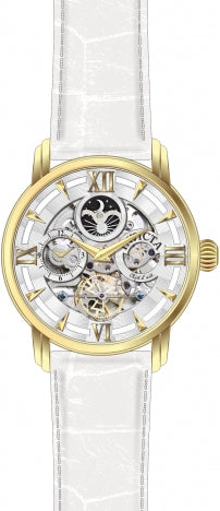 A Caixa e Mostrador deste relógio medem 47 mm, sendo feitas em aço inoxidável, garantindo durabilidade e resistência. Seu tipo de coroa é Push e seu cristal é de Fusão de Chamas, proporcionando um design único e moderno. Com movimento automático e resistência à água de 50m, é perfeito para qualquer ocasião. Sinta-se elegante e confiante com sua pulseira de couro branco de 205mm de comprimento.
