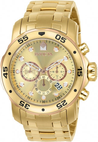 Apresentando o Relógio Invicta 80071, perfeito para quem busca elegante e resistência. Com uma caixa de 48 mm em aço inoxidável e moldura disponível nas cores preto, dourado e ouro rosa, possui uma coroa push e um cristal resistente a chamas. Seu movimento de quartzo VD53 oferece alta precisão e sua resistência à água de 200m permite seu uso em atividades aquáticas. A pulseira de aço inoxidável dourado adiciona um toque de sofisticação ao relógio. Comprimento de 195mm e largura de 26mm, é o acessório ideal para qualquer ocasião.